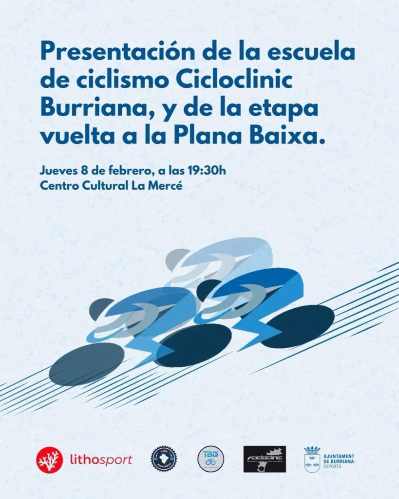 Con motivo de la “Volta a la Plana Baixa 2024”, que recorrerá su primera etapa en Burriana el próximo 9 de febrero, se realizará el día 8, a partir de las 19.30 horas, la presentación de la ronda júnior que se prolongará hasta el día 11, además de la escuela de ciclismo TBG Cicloclinic Burriana, del equipo cadete TBG Lithosport y el conjunto júnior Ayuso Team UAE. El acto tendrá lugar en el Centro Municipal de Cultural La Mercé de Burriana.
