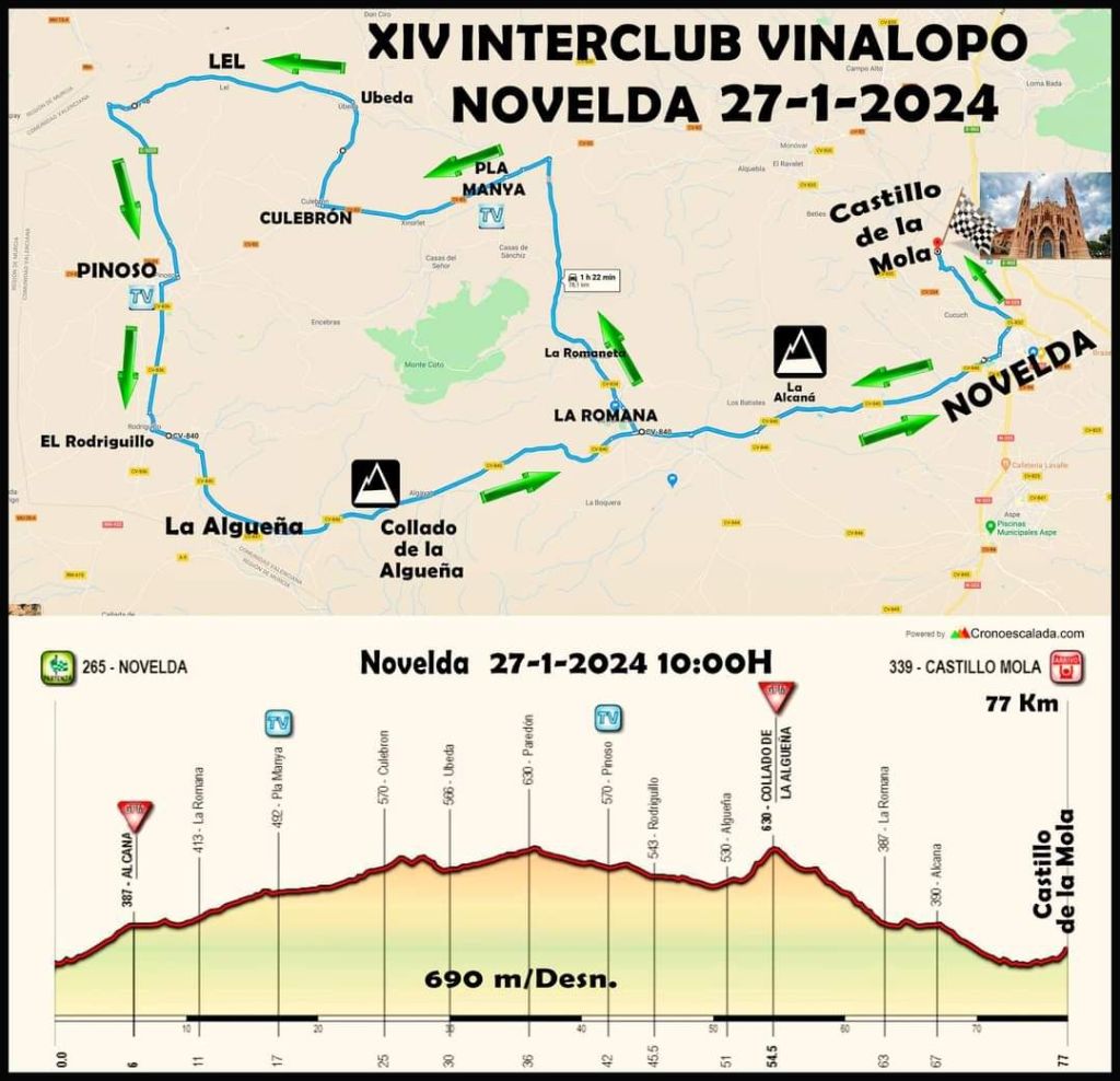 Novelda acoge el sábado la segunda prueba de la XL Interclubs Vinalopo. Desde las 15:00 horas (Velodromo) el pelotón tendrá por delante casi 80 kilómetros de recorrido. Pasará por Alcana (3ª), La Romana, Romaneta, Manya, Culebron, Úbeda, Lel, Paredón, Pinoso, Rodriguillo, Algueña, Collado de la Algueña (2 Km al 5%) La Romana y, de nuevo en Novelda, con un final exigente en la subida final al Castillo de La Mola.