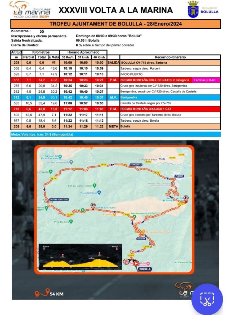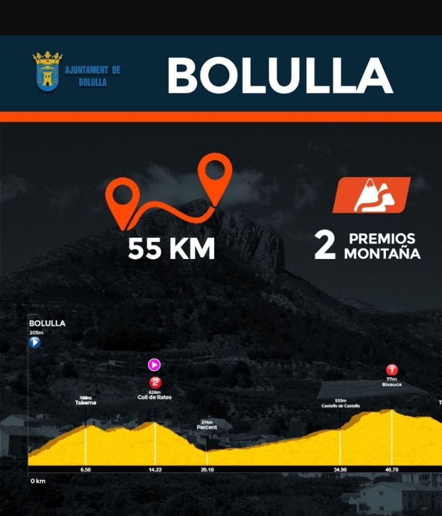 Bolulla acoge este domingo la segunda cita de la XXVIII Volta a La Marina con los ascensos al Coll de Rates (vertiente Callosa d’Ensarria) y la Bixauca (Sa Creueta) como clarísimos protagonistas en un recorrido de 55 kilómetros. La salida es a las 10 horas. Juan Pedro López llega como líder a la carrera.