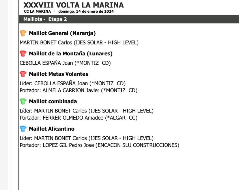 Carlos Martín se ha vestido de líder, lidera la combinada y es el mejor alicantino, mientras que Joan Cebolla lleva los maillots de la montaña y metas volantes.