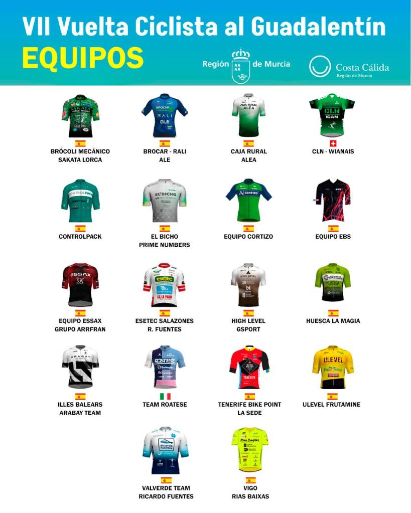 La VII Vuelta Ciclista al Guadalentín-Región de Murcia, que se disputa del 2 al 4 de febrero, cuenta con 18 escuadras. En la salida estarán el Equipo Essax-Grupo ARRFRAN y el Brocar-Rali-Alé. Los sajeños competirán con Tadeo Rodríguez, Carlos Ortega, Mateu Esterlich, Adrián Fajardo, Diego Salvador y César Pérez. Por su parte, los alcoyanos alinearán a Josep Tomás, Álvaro Sagrado, Ewan Warren, Ibán Gutiérrez, Mario Granero y Calum Philip Moir.