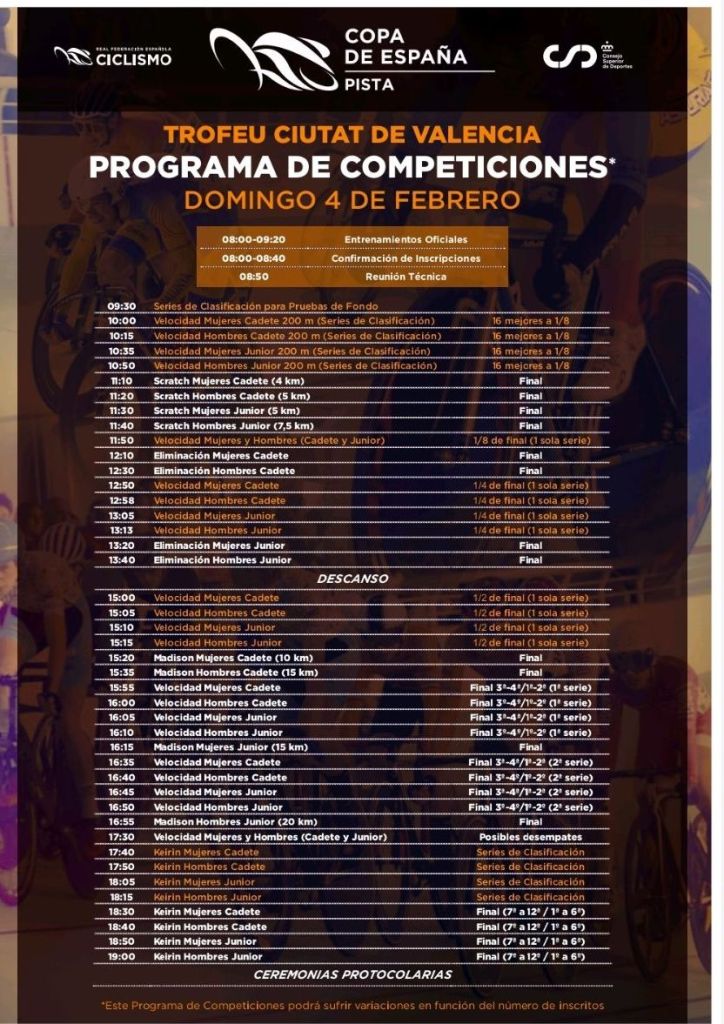 La Federación de Ciclismo de la Comunitat Valenciana estará al cargo de la organización de esta última cita de la Copa de España de Pista, que contará con un programa de competición que contempla la disputa de las pruebas de Velocidad Individual, Keirin, Scratch, Eliminación y Madison. El inicio de la jornada está previsto que se produzca a las 9:30 h. En torno a las 14:00 h se pondrá fin a la sesión de mañana, mientras que la acción en el velódromo se retomará a las 15:00 h para prolongarse hasta aproximadamente las 19:00 h; momento en el que darán comienzo las ceremonias protocolarias.