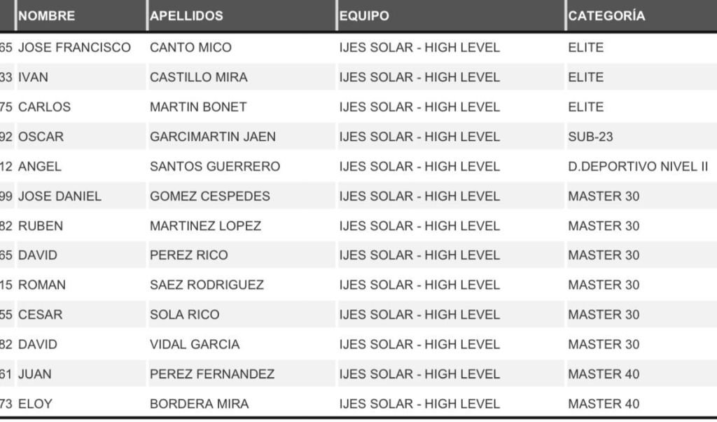 Ijes Solar sigue siendo el patrocinador principal de la escuadra máster alicantina, además de Hig Level. Los retos vuelven a ser los mismo y se llega muy ilusionado a este inicio de campaña. El pasado fin de semana fue para enmarcar. Carlos Martín terminó tercero en la ya mítica meta del castillo de la Mola en Novelda el sábado en la segunda etapa del Interclub Vinalopó. El domingo, en Bolulla, Martín lograba el triunfo en la segunda jornada de la Volta La Marina y se vestía de líder y el equipo era el mejor.