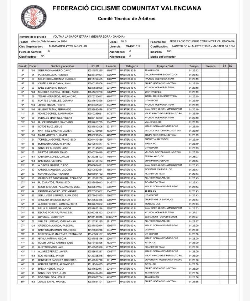 David Serrano (Team Ekijon) se ha impuesto en Benirredrá en la primera jornada de la Volta a La Safor que ha partido de Gandía y ha contado con 70 kilómetros de recorrido. Ha batido al esprint a Héctor Pons ( Calderonabike) tras parar el reloj en la hora, 25 minutos y 13 segundos. A cinco segundos, tercero, Enrique Molinero (Hyundai), ha dado tiempo al pelotón.