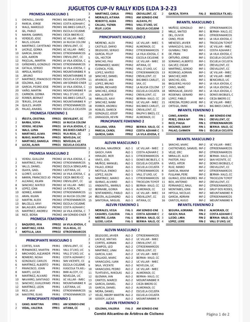 Hoy se ha disputado en Elda, en el Paraje de La Torreta, el Juguettos Cup IV Rally Kids BTT con 226 ciclistas en competición. Los ganadores han sido: David Chenoll (Big Bikes) y Cristina Iñesta (Crevillent), en Promesas 1;Guillem Verdú (La Vila) e Iria Baquero (La Vila), en Promesas 2; Iván Cortés (Crevillent) y Martina Cano (AM Sonido), en Principiantes 1; Álex Moreno (UC Villar) y Vera Fullana (Bernia Xaló), en Principiantes 2; Maverick Molina (UC Villar) y Vega Morales (AM Sonido), en Alevines 1; Javier Delegido (Citroen Marcos) y Valeria Coloma (AM Sonido), en Alevines 2; Gonzalo Muñoz (Citroen Marcos) y Ainhoa Cano (AM Sonido), en Infantiles 1; y Marc Sancho (UC Villar) y Adriana Segura (Almoradí), en Infantiles 2.