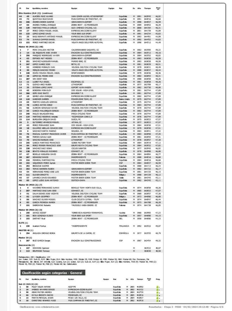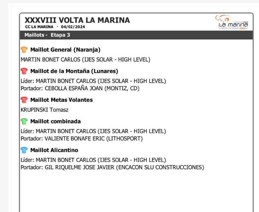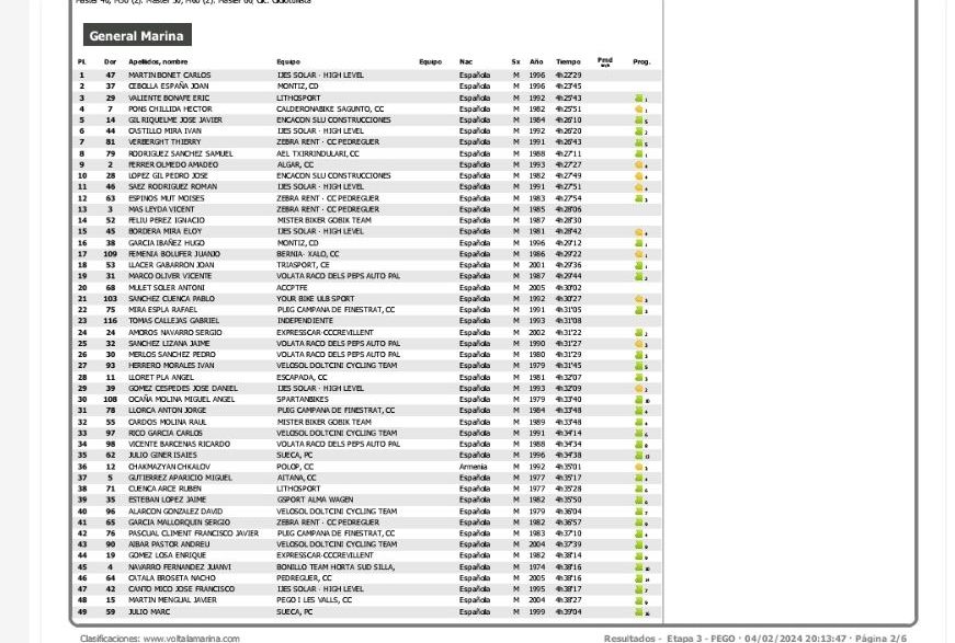 Eduardo Llacer (La Valldigna) se ha impuesto en el alto de Miserat en la tercera cita de la Volta La Marina. Ha entrado en solitario en meta dando una auténtica exhibición tal como hizo en la edición de 2022. Ya puede ser considerado como el auténtico »águila del Miserat». Carlos Martín (Ijes Solar) ha sido segundo y Sergio Ruiz (Encacon) ha finalizado tercero. Llacer tambien se ha adjudicado la montaña; Jaime Sánchez, las metas volantes; yel Ijes Solar ha sido la mejor escuadra. Carlos Martín sigue de líder, por delante de Joan Cebolla y de Eric Valiente. Martín lleva también el maillot de la montaña y la regularidad, y, Jaime Sánchez, en de las metas volantes.