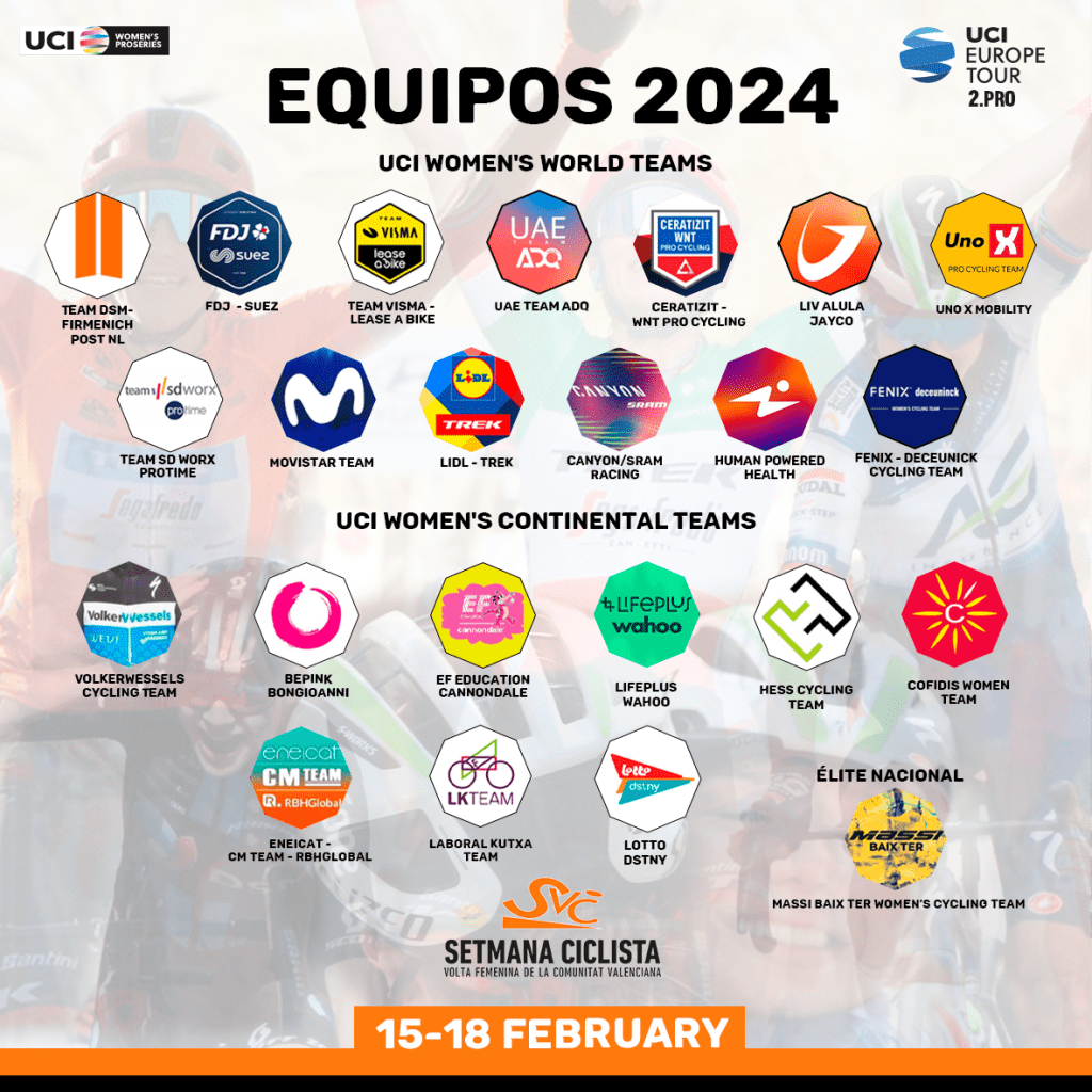 La 8ª edición de la Setmana Ciclista volverá a contar con un plantel de equipos de máximo nivel que dará color al exigente recorrido. Un total de 23 equipos, entre ellos 13 UCI WWT, 9 de los mejores conjuntos de categoría UCI Continental y el conjunto Élite Nacional, Massi Baix Ter Women’s Cycling Team.