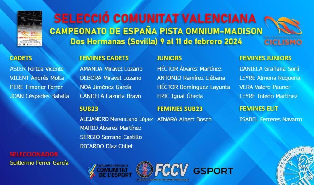 El Velódromo de Dos Hermanas será este próximo fin de semana, 10 y 11 de febrero, escenario de la celebración del Campeonato de España de Omnium y Madison de las categorías Élite-Sub23, Junior y Cadete. Será la primera gran cita del calendario nacional de pista en esta presente campaña y congregará a gran parte de las referencias de la especialidad de nuestro país, así como a los jóvenes talentos emergentes de la misma. Acude la Selección de la FCCV9 de Guillermo Ferrer con muchas posibilidades de estar en los distintos podios.