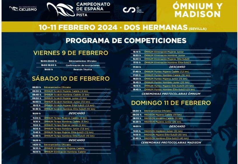La acción en el Velódromo de Dos Hermanas dará comienzo el sábado 10 de febrero a las 9:30 h y a lo largo del día, hasta las 20:15 h aproximadamente, cuando está previsto la conclusión de esta primera jornada de competición, se disputarán el Scratch, Tempo Race, Eliminación y Puntuación del Omnium Élite-Sub23, junior y cadete, que nos permitirán conocer a los nuevos campeones de España de la modalidad. Entre las mujeres de la categoría Élite-Sub23 parten como nombres a seguir los de Eukene Larrarte, gran favorita; Laura Rodríguez, que se hizo con la victoria el año pasado; Ziortza Isasi; Isabel Ferreres, Izzy Escalera, Eva Anguela o Marina Garau. En la competición masculina, Erik Martorell y los hermanos Bennassar, Francesc y Jon Martí, son los principales candidatos a una victoria que también querrán pelear Álvaro Navas, Telmo Semperena o José Segura.