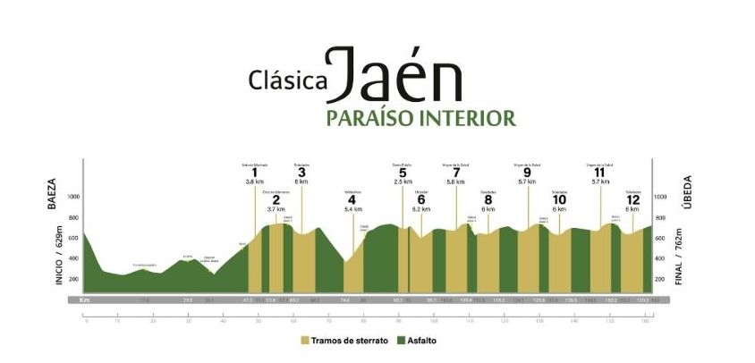 En cuanto a recorrido, la Clásica Jaén Paraíso Interior 2024 unirá como cada año las Ciudades Patrimonio de la Humanidad de Baeza y Úbeda, atravesando igualmente Torreblascopedro, Linares, Ibros y Santa Eulalia. En la travesía de 162 kilómetros se superarán 2.500 metros de desnivel acumulado y nada menos que 12 Caminos de Olivos: sectores de ‘sterrato’ o gravilla que totalizarán nada menos que 62 kilómetros. La carrera se resolverá en un circuito final de 20,4 kilómetros que, pasando por Úbeda y Baeza, decidirá la carrera con tres vueltas de gran intensidad. Será la Calle Obispo Cobos del municipio ubetense la que contemplará al sucesor de Alexey Lutsenko (2022) y Tadej Pogačar (2023) en el palmarés de la jovencísima prueba patrocinada por la Diputación de Jaén.