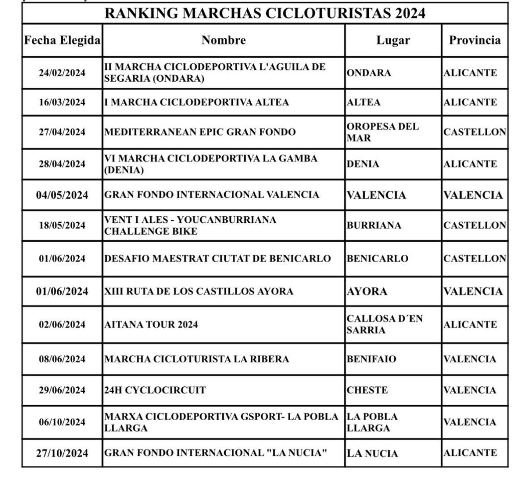 La Comisión de Cicloturismo informa que serán 13 las marchas cicloturistas inscritas en el calendario oficial, que se incluyen en el Ranking de CICLOTURISME COMUNITAT VALENCIANA 2024. El 24 de marzo se organizadora en Ondara la primera y finalizará el Torneo el 27 de octubre en La Nucía. En 2023 se organizaron seis carreras.