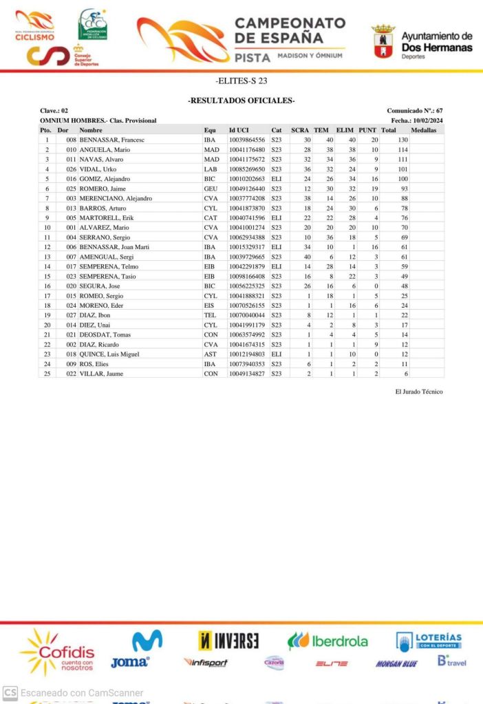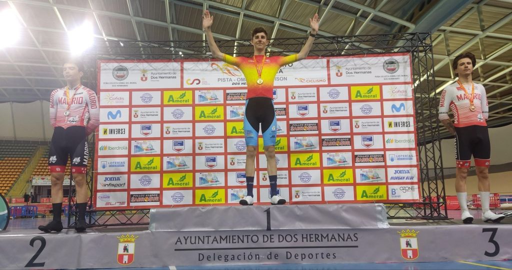 Uno de los momentos que no olvidarán fácilmente los asistentes al Velódromo de Dos Hermanas en el día de hoy será la Puntuación que ha completado Héctor Álvarez en el Omnium junior. El vigente campeón de Europa de la modalidad ha tenido un complicado arranque y únicamente ha podido ser 7º en el Scratch, 6º en la Tempo Race y 4ª en la Eliminación, donde fue sacado de carrera por los jueces árbitros tras progresar por el pasillo azul. Álvarez ha llegado a la Puntuación final en 4ª posición con 92 puntos, a 22 puntos de su compañero Toni Ramírez, que lideraba tras haber hecho un Omnium casi perfecto siendo 2º en el Scratch, 1º en la Tempo Race y 3º en la Eliminación. Lo que ha sucedido a partir de entonces en la Puntuación, en un velódromo de 333,3 metros de cuerda, ha sido propio de un ciclista con un talento muy especial. Ha arrancado junto a Rubén Sánchez, campeón del mundo de Eliminación, y gracias a una excelente colaboración han terminado ganando vuelta al pelotón tras jugar con él y posponer el momento de la captura en un par de ocasiones para sumar unos cuantos puntos más en los sprints intermedios. Restaban unas 25 vueltas para el final en el instante en que Álvarez y Sánchez han doblado y han resultado ser suficientes para que el campeón de Europa tomará un breve respiro y atacara de nuevo junto a Antonio Ramírez. Los dos compañeros de selección han cogido vuelta de nuevo y con ello Álvarez ha terminado de rematar esta portentosa actuación que le ha llevado al título. 79 puntos ha sumado en esta definitiva Puntuación para terminar con 171 puntos, por los 157 puntos que ha logrado Ramírez, que ha sido segundo. El podio lo ha completado Joan Roca con 117 puntos.
