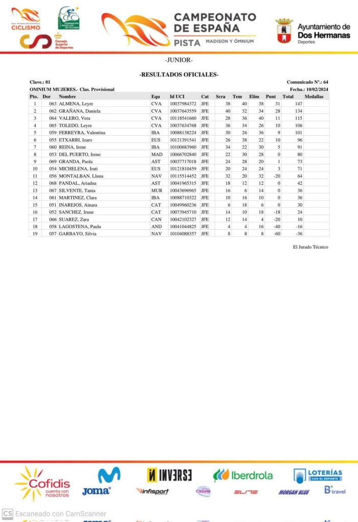 En el Omnium junior femenino, Leyre Almena, a pesar de estar cursando sus primeros meses en la categoría, ha dejado claro en el día de hoy que se trata de una ciclista de gran calidad y proyección. La corredora de la Comunidad Valenciana ha sido 2ª en el Scratch, solo superada por su compañera Daniela Grañana, 1ª en la Tempo Race y en la Eliminación ha logrado otra 2ª plaza, pero tras cederle la victoria a su compañera Vera Valero. En la Puntuación ha vuelto a dominar yéndose hasta los 31 puntos para concluir con 147 puntos y hacerse con el título de campeona de España. Hay que destacar el absoluto dominio mostrado por la selección de la Comunidad Valenciana, que ha situado a cuatro corredoras en los cuatro primeros puestos. Tras Almena, ha terminado segunda Daniela Grañana, con 134 puntos, y tercera Vera Valero, con 115 puntos. En cuarta posición ha concluido Leyre Toledo, que ha sumado 106 puntos.