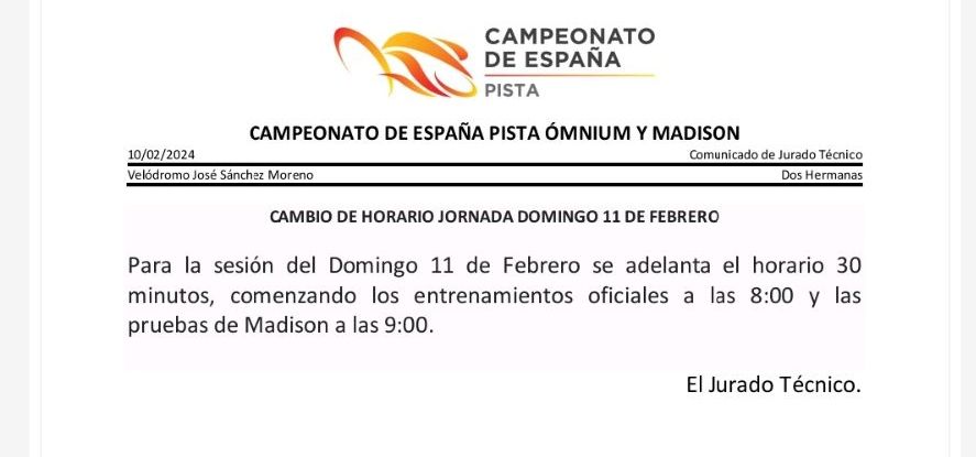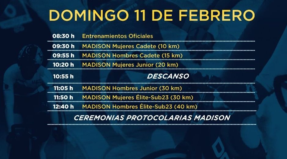 La jornada del domingo 11 de febrero queda reservada íntegramente para la celebración de las pruebas de Madison, que se adelanta el horario media hora que comiencen a las 9:00 h y que concluirán sobre las 13:00 h de la tarde.