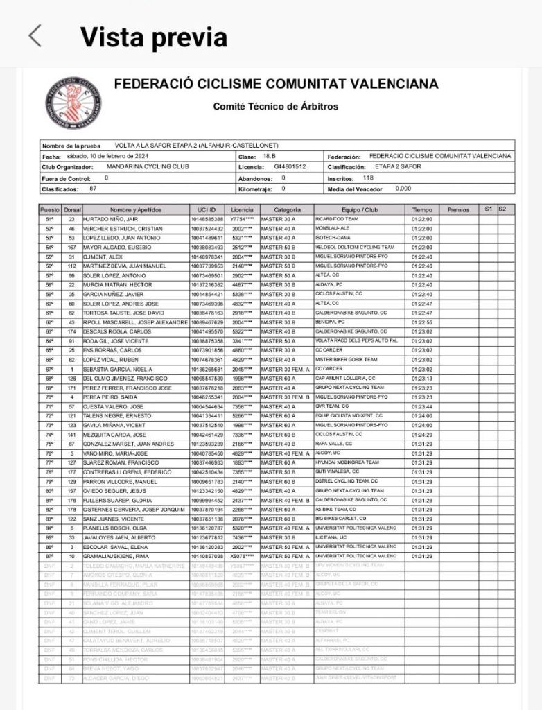 Etapa 1. Benirredrá-Gandía. Clasificaciones