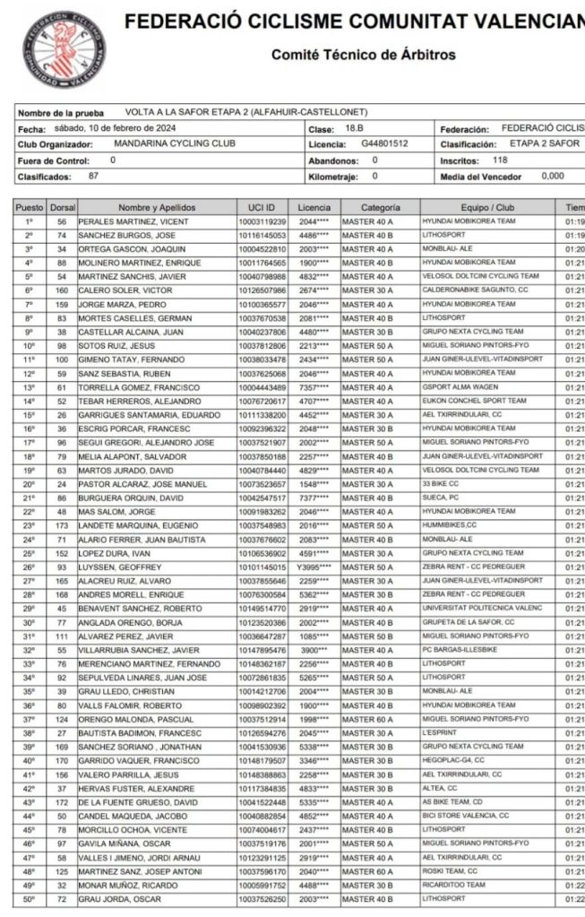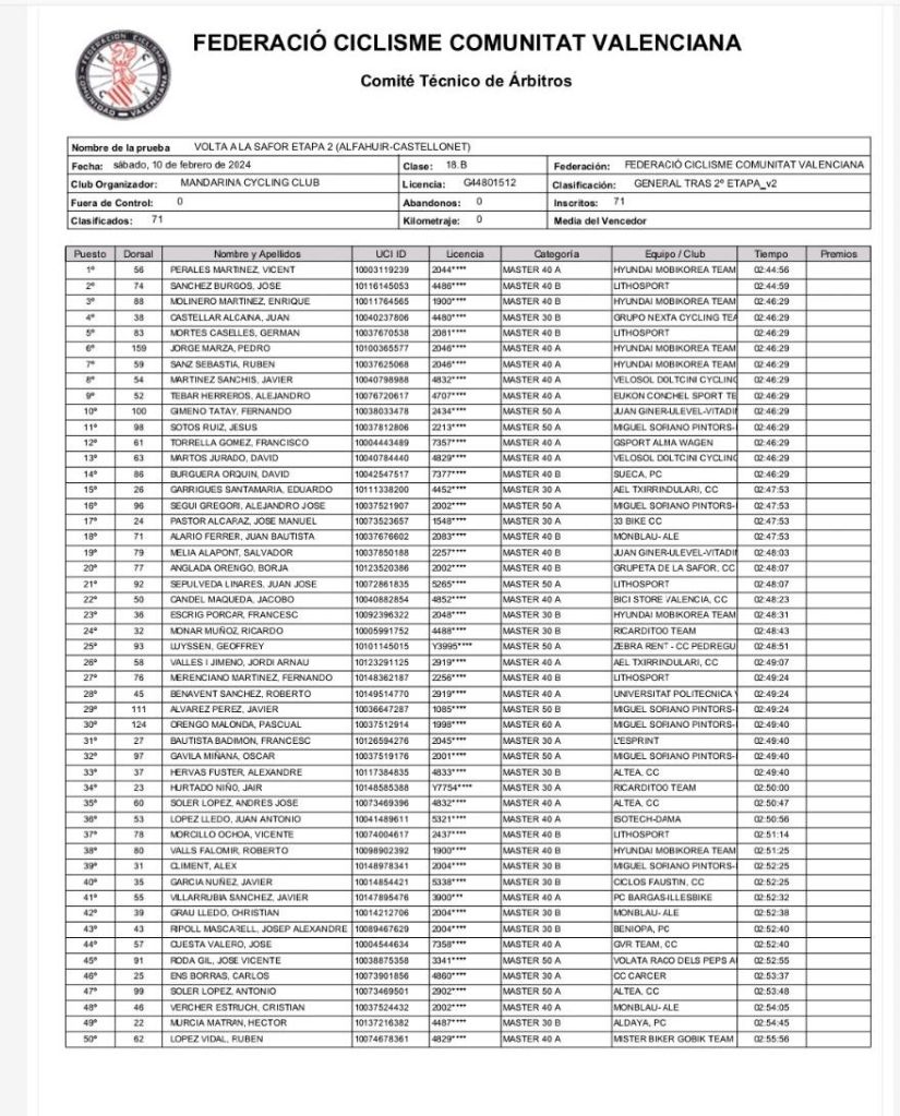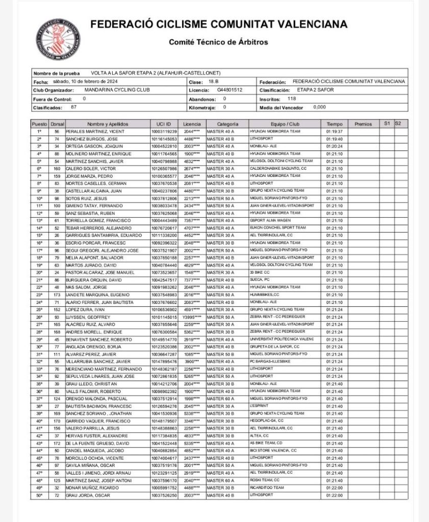 Vicent Perales es el nuevo líder de la prueba tras la disputa de la segunda jornada de la Volta a La Safor. Perales es el mejor M40A; Sánchez lidera la clasificación de los M40B; Eduardo Garrigues, la de los M30 A; Juan Castellar, la de los M30B; Fernando Gimeno, la de los M50A; Javier Álvarez, de los M50B; Pascual Orengo Malonda, de los M60A. Noelia Sebastiá, en la primera fémina. También domina en M30A. Saida Perea es la mejor M30B; María José Vaño comanda la clasificación de los M40A; Elena Escobar, la de las M50A; Rima Gramaliauskiene, la de las M60A.