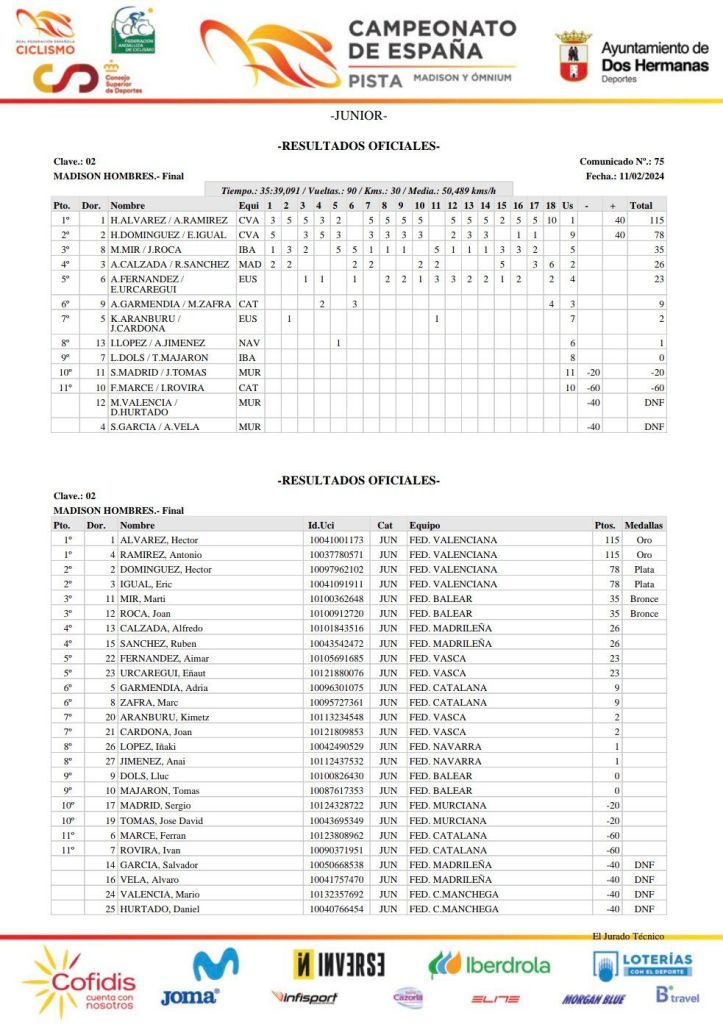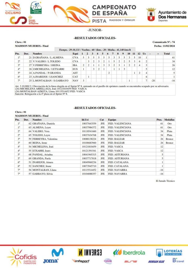 En categoría junior, hemos asistido a sendas exhibiciones de Leyre Almena y Daniela Grañana y de Héctor Álvarez y Antonio Ramírez, que han transmitido tener controlada la prueba en todo momento. Almena y Grañana han logrado acumular 61 puntos tras puntuar en los 12 sprints y ganar 10 de ellos. Un dominio absoluto que no ha permitido a sus compañeras de selección Leyre Toledo y Valentina y Vera Valero, que han finalizado segundas con 34 puntos, inquietarlas en la pugna por la victoria. El bronce en esta Madison junior femenina ha sido para las baleares Valentina Ferreyra e Irene Reina, que han concluido con 26 puntos.