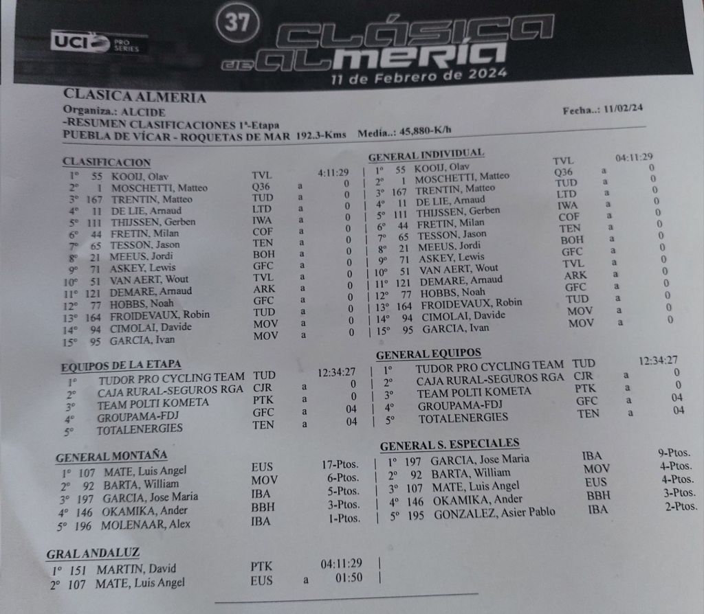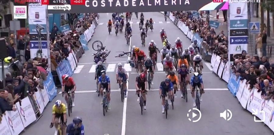 Olav Kooij (Visma-Lease a Bike) se ha hecho con la victoria en la Clásica a Almería 2024, imponiéndose en el esprint final a los italianos Matteo Moschetti y Matteo Trentin, segundo y tercero respectivamente. El velocista neerlandés aprovechó el lanzamiento perfecto de Wout van Aert en los metros finales para levantar los brazos y certificar el favoritismo del Visma. La dupla del Giro ya funciona. Mala suerte la de Manuel Peñalver (Polti-Kometa). El torrevejense ha sufrido una caída en el esprint cuando luchaba por los primeros puestos. En los metros finales, y en plena pelea por la victoria, Arnaud Démare se pudo sujetar sobre Manuel Peñalver, provocando que el torrevejense quedase encerrado contra la valla y sufriese una peligrosísima caída que pudo tener consecuencias. Arrastra contusiones y abrasiones. Podrá afrontar los próximos compromisos.