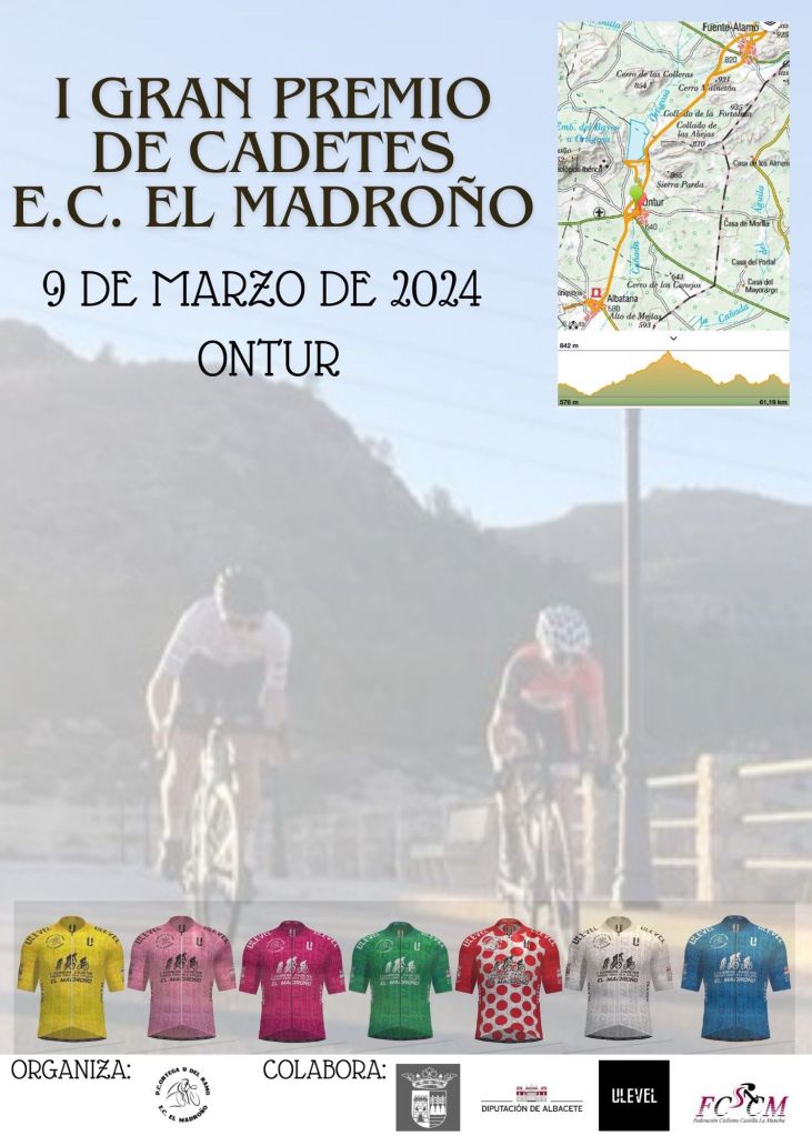 El próximo 9 de marzo se disputará en Ontur, a partir de las 11 horas, el I Gran Premio de Cadetes E. C. El Madroño. La prueba cuenta con 62 kilómetros de recorrido y se desarrollará por un circuito interurbano por las poblaciones de Ontur, Albatana y Fuente-Álamo. El plazo de inscripciones está abierto en la web de la Federación de Ciclismo de Castilla- La Mancha.