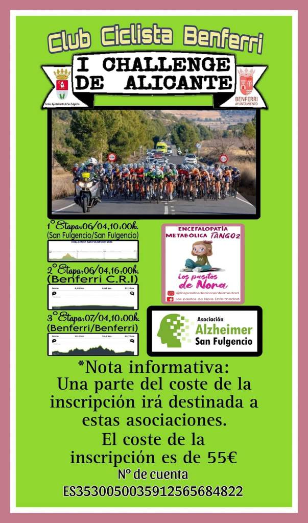San Fulgencio y Benferri serán los protagonistas de la I Challenge de Alicante que se disputará los días 6 y 7 de abril. La ronda comenzará con una prueba en línea en San Fulgencio a partir de las 10 horas el 6 de abril. Ya, por la tarde, a partir de las cuatro, Benferri acogerá una contrarreloj individual. Y el día 7, el pelotón afrontará una jornada en ruta con salida y meta en Benferri. Parte de la recaudación de la inscripción ira a parar a asociaciones benéficas, Asociación de Alzheimer de San Fulgencio y Encefalopatía Metabolica Tango 2. El coste de la inscripción es de 55 euros. Para todo que se inscriba antes del 1 de marzo tendrá un coste de 45 euros, es decir, diez menos (Sólo para las 100 primeras plazas).