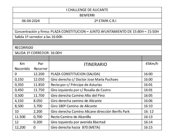Etapa 2. Día 6 de abril. CRI. Benferri. 16 horas, el primer ciclista. 12,200 Km.