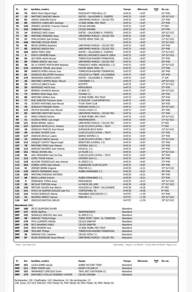 Ottesen ha sido también el primer élite y sub23; Girona se ha impuesto entre los M40; Teófilo Jiménez (Uniformes Murcia) ha sido el mejor M30; José Carlos Corrales (Ciclos Sarabia) vence en M50; y Jozsue Juhasz (Torrevieja), en M60. Alexis Rodríguez (Esetec) fue el mejor júnior. El Telfy ha sido la mejor escuadra.