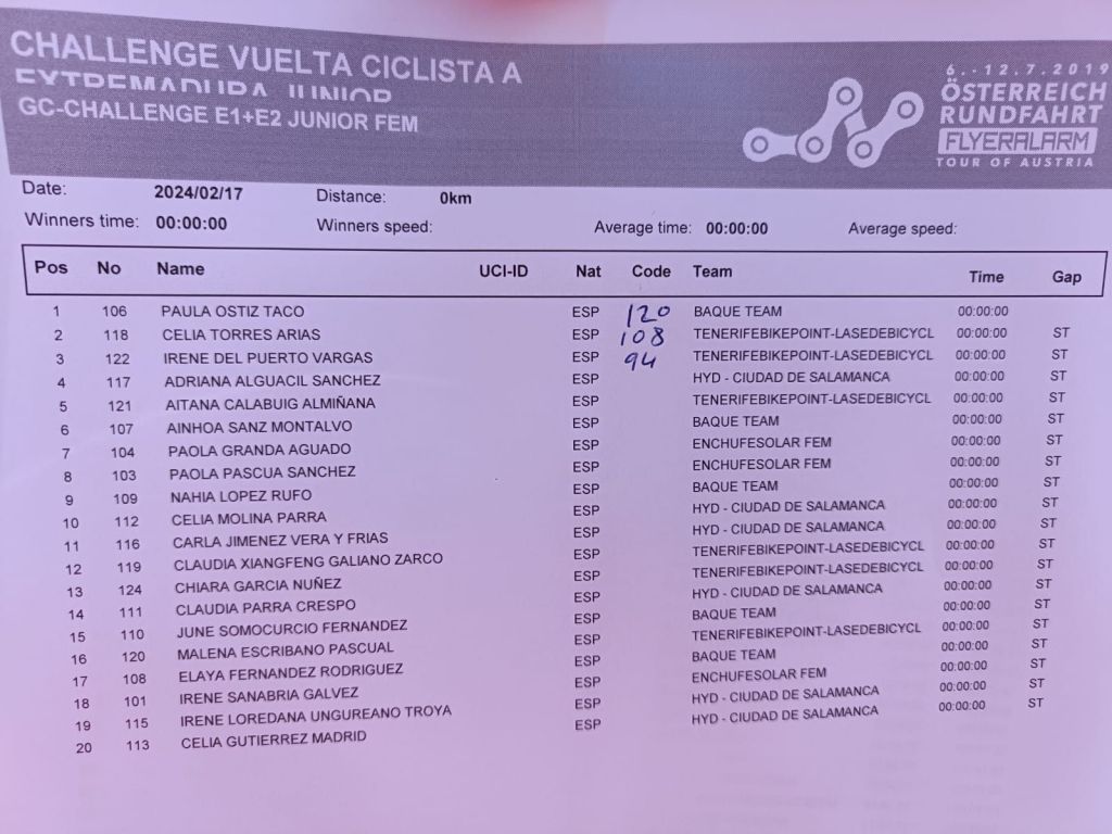 Paula Ostiz (Baqué Team) se ha impuesto también hoy en la segunda etapa de la Challenge Vuelta Ciclista Extremadura Júnior, en la categoría femenina, con salida y meta en Plasencia. La ciclista navarra se ha adjudicado la General. En la jornada de hoy Celia Torres (Tenerife Bike Point-La Sede) ha sido segunda y Aitana Calabuig (Tenerife Bike Point-La Sede), tercera.