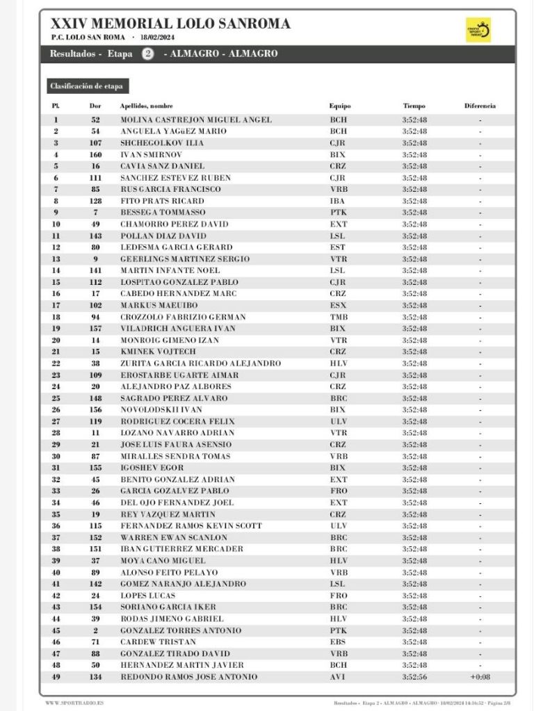 Doblete para El Bicho en la segunda y última etapa del Memorial Sanroma disputada en Almagro. Miguel Ángel Molina ha sido el ganador por delante de Mario Anguela. La tercera plaza la ha ocupado Ilia Shchegolkov (Filial Caja Rural-Alea).
