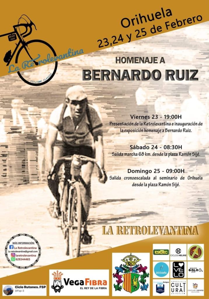 La «Retrolevantina Ciclismo Clásico» organiza este fin de semana, los días 23, 24 y 25 de febrero, un homenaje a Bernardo Ruiz (99 años). El viernes tendrá lugar la presentación de la Retrolevantina y la inauguración de la exposición con Bernardo Ruiz como protagonista del pintor sebatense Miguel Soro. También habrá una charla coloquio con varios ponentes, entre los que destacan Marino Lejarreta, Bernardo Ruiz (hijo), Miguel Soro y Fran Gaitán, El sábado se realizará una marcha de 69 kilómetros y el domingo una cronoescalada al Seminario de Orihuela partiendo de la Plaza Ramón Sijé.