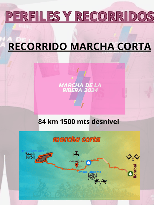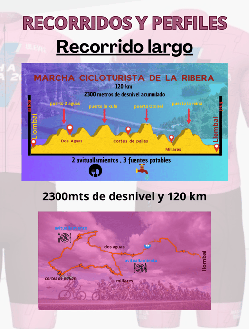 La Marcha cicloturista de la Ribera 2024, que se disputará el 8 de junio en Llombai, recorre las carreteras de Dos Aguas, Cortes de Pallas, Millares. Un recorrido lleno de duros puertos, túneles puentes sobre majestuosos embalses, impresionante cañones… que hará las delicias de los cicloturistas. Cuenta con dos recorridos: Uno largo de 120 kilómetros y 2.300 metros de desnivel y, otro corto, de 84, de 1.500+.