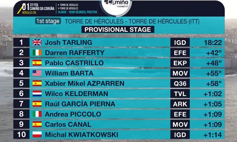 Joshua Tarling ha ganado la contrarreloj individual inaugural de O Gran Camiño 2024. El joven campeón de Europa de 20 años en esta disciplina derrotó a Darren Rafferty y Pablo Castrillo, convirtiendo al británico del INEOS Grenadiers también en el primer líder. La organización ha decidido que los tiempos de la crono no computen para la General debido a las ráfagas de viento que han soplado durante la celebración de la carrera. Los corredores han tenido que participar con las bicicletas convencionales.