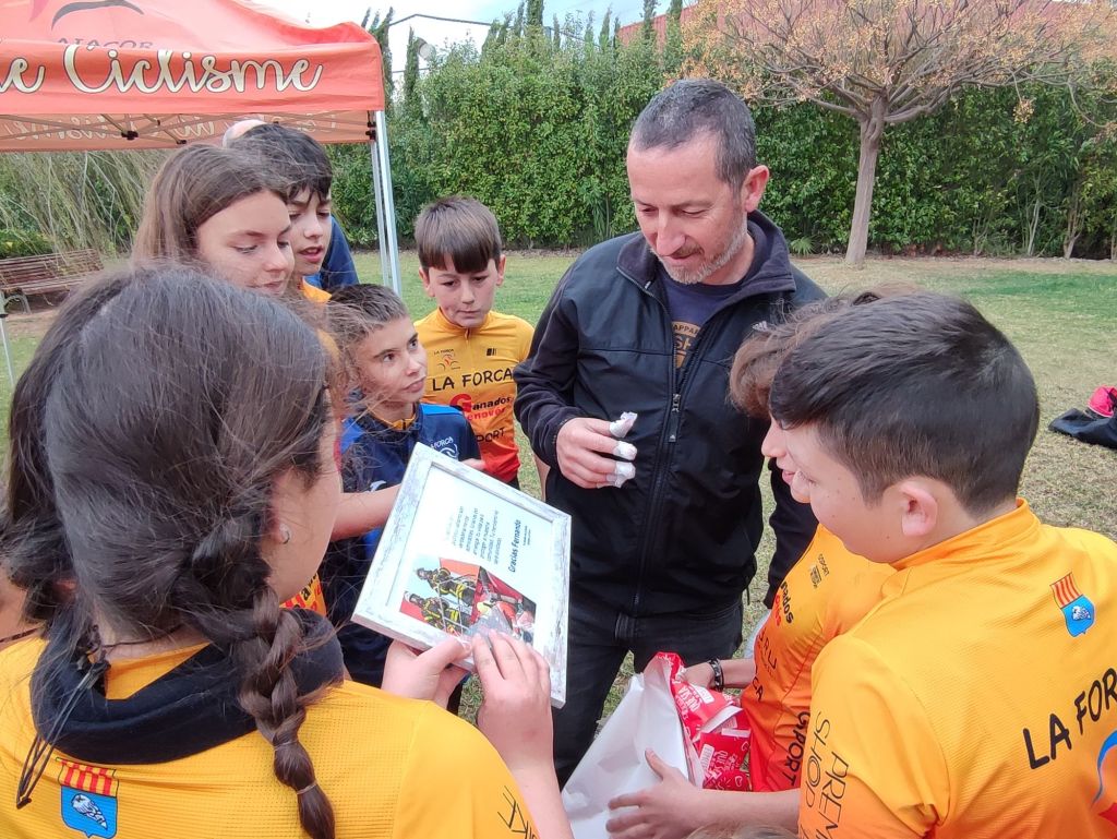 La escuela de ciclismo, de la cual forman parte sus dos hijos, le ha entregado durante la presentación de la plantilla de 2024, un cuadro con una fotografía para reconocer su trabajo y ensalzar su «dedicación y profesionalidad»