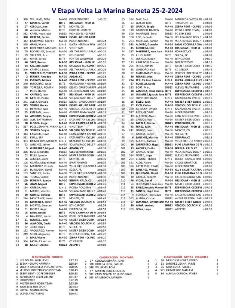 Barxeta ha disfrutado hoy el triunfo de Tom Williams como vencedor de la quinta prueba de la Volta La Marina que ha contado con 82 kilómetros de recorrido. Ha parado el reloj en la hora, 45 minutos y 20 segundos. Ha sido el más rápido de una escapada de seis corredores en la que el líder Carlos Martín (Ijes Solar) ha sido segundo; Joan Cebolla (CD Montiz), tercero; Markus Auvinen (Idrott), cuarto; Hugo Juan Carsi (High Level Gsport), quinto: y, Carlos Ortega (Essax), sexto. Joan Cebolla ha ganado hoy la montaña; Pedro Merlos, las metas volantes; y, el Ijes Solar se ha impuesto por escuadras.