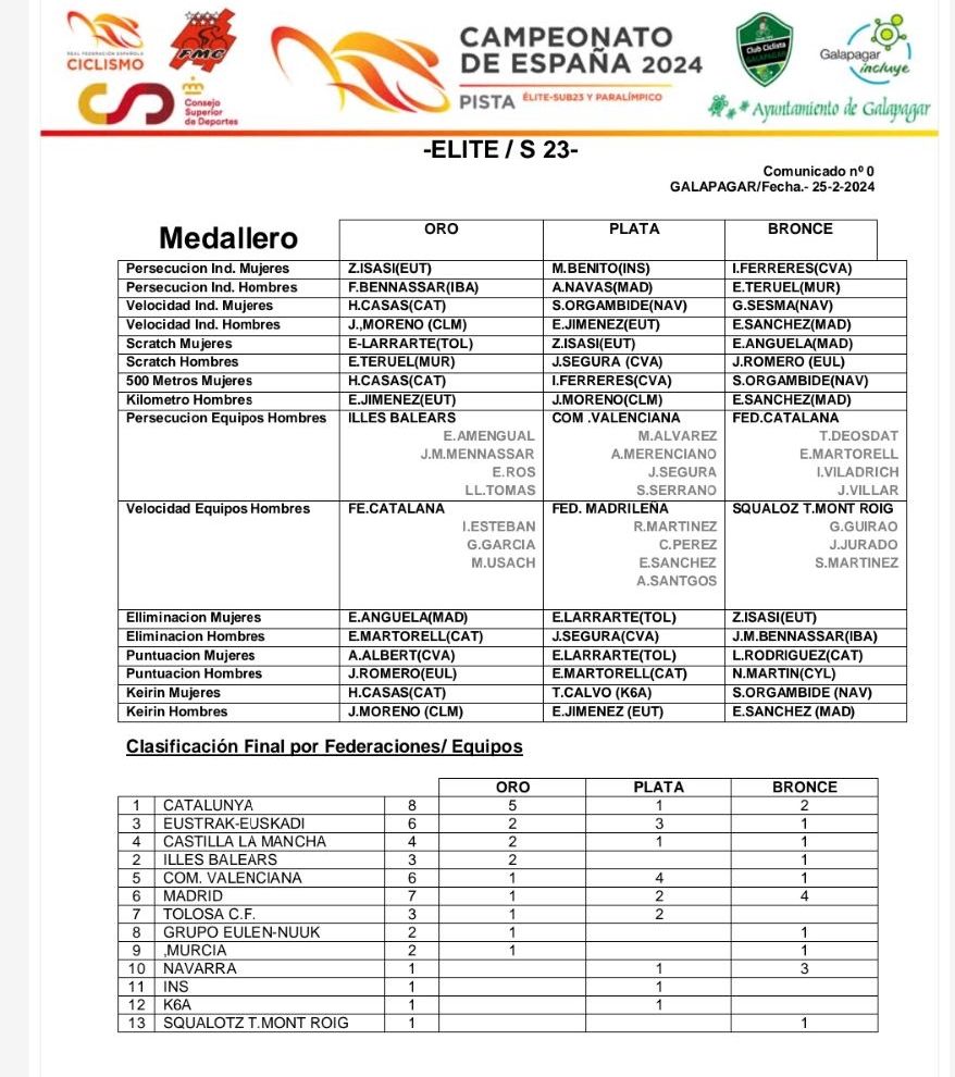 La Selección Elite y Sub 23 de Pista de la Comunidad Valenciana que dirige Guillermo Ferrer logró seis medallas y dos títulos de campeones nacionales de Sub 23 en el Campeonato de España celebrado este pasado fin de semana en Galapagar. Ainara Albert consiguió el oro en la prueba de Puntuación; la plata se la colgaron José Segura (Elimación y Scratch), Isabel Ferreres (500 Metros) y el equipo de Persecución formado por Mario Álvarez, Alejandro Merenciano, José Segura y Sergio Serrano; y el bronce, Isabel Ferreres, en Persecución. Además, Ainara Albert se proclamó de España Sub 23 en Persecución y José Segura en Eliminación y Scratch.