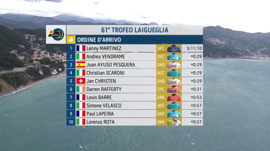 Lenny Martínez coronó su mejor estado de forma con una victoria en el Trofeo Laigueglia. El francés de 20 años de Groupama-FDJ logró ganar en solitario en la prueba inaugura la de la temporada italiana. Martínez también ganó recientemente el Classic Var y el fin de semana pasado terminó segundo detrás de Jonas Vingegaard en O Gran Camiño. Andrea Vendrame (Decathlon) ha sido segundo y Juan Ayuso (UAE Team Emirates), tecero.