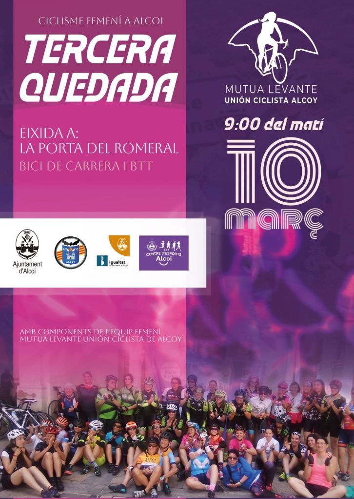 El próximo 10 de marzo se disputa en Alcoy la tercera «Quedada de Ciclismo Femenino». Con motivo del 8 de marzo el Ayuntamiento de Alcoy ha organizado junto con los clubes de la ciudad una serie de actividades deportivas entre las que se encuentra esta prueba. La Unión Ciclista Alcoy ha preparado una quedada de bici de carretera y otra de montaña con el objetivo de visibilizar el incremento de mujeres en este deporte en la ciudad y reivindicar la integración en el mismo. Habrá componentes del equipo del club Mutua Levante – Unión Ciclista Alcoy en dicha actividad.