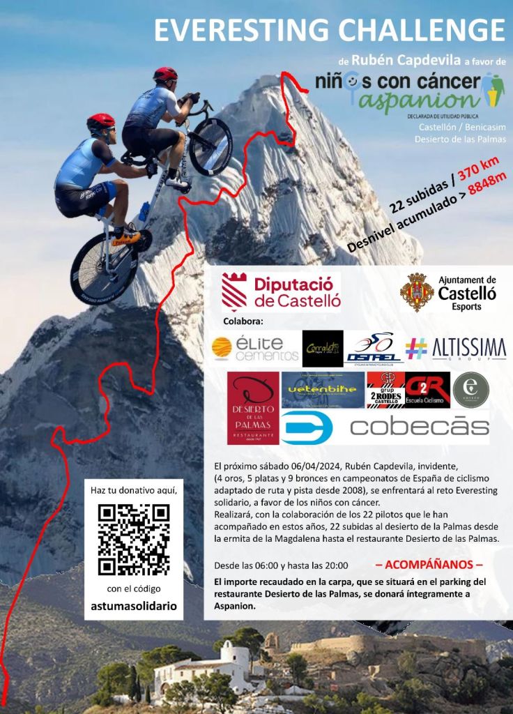El sábado, día 6 deabril, Rubén Capdevila se enfrentará al reto Everesting Challenge Solidario, a favor de los niños con cáncer. Realizará, junto a los 22 pilotos que le han acompañado en estos años, veintidós subidas en Castellón al Desierto de Las Palmas desde la ermita de la Magdalena. Es decir, 370 kilómetros y un desnivel acumulado de 8.848 metros. Partirá a las seis de la mañana y tiene previsto finalizar sobre las 20 horas. Cada vuelta supone alrededor de 45 minutos. El importe recaudado en la carpa, que se situará en el parking del restaurante Desierto de las Palmas, se donará integramente a Aspanion. Tambiénsse puede hacer aportaciones a la asociación Aspanion , o bien por mediación del QR o por este enlace, https://publuu.com/flip-book/416817/941980.
