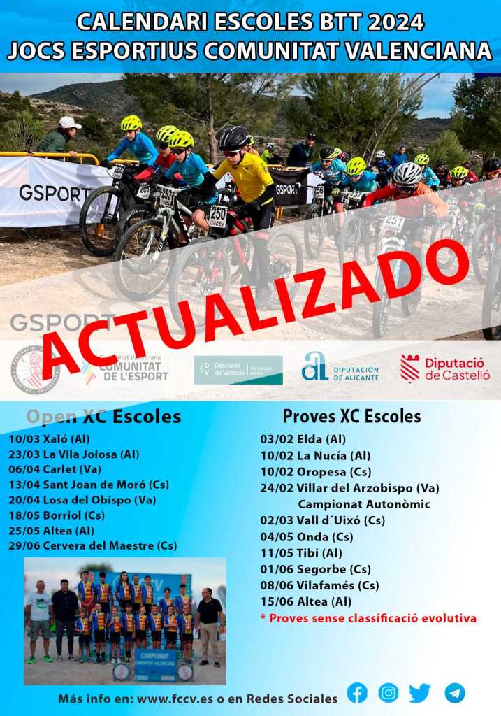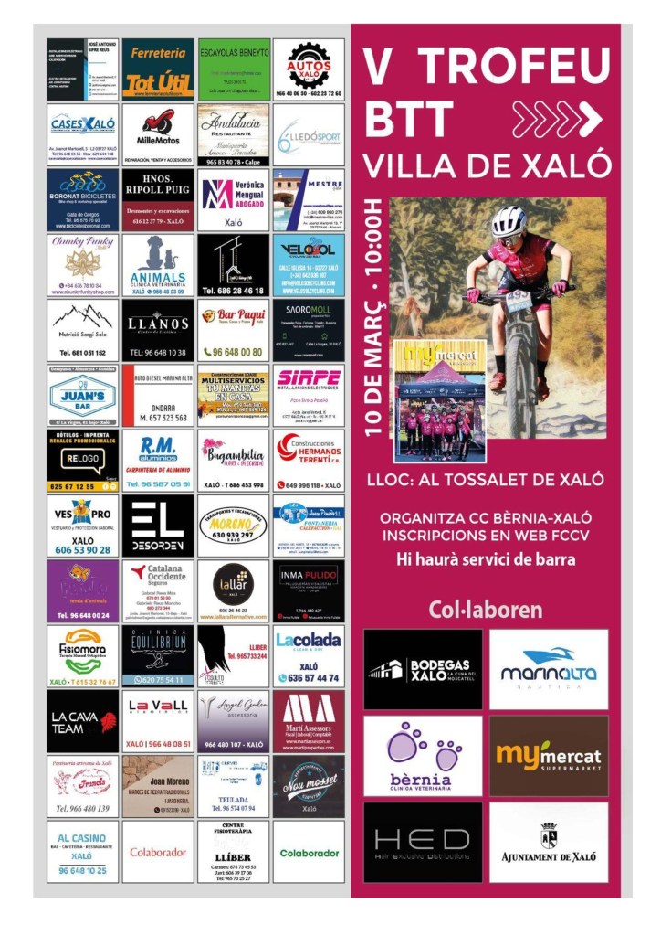 Xaló abre el domingo, a partir de las 10 horas, el Open BTT-XCO Escuelas de la Comunitat Valenciana. La competición está organizada por el Club Ciclista Bernia-Xaló, a partir de l as 10:00, en el Al Tossalet de la localidad alicantina. El plazo de inscripciones del V Trofeu Villa de Xaló está abierto hasta el jueves , día 7 de marzo, a las 20:00. https://fccv.es/…/smartweb/inscripciones/inscripcion/28402