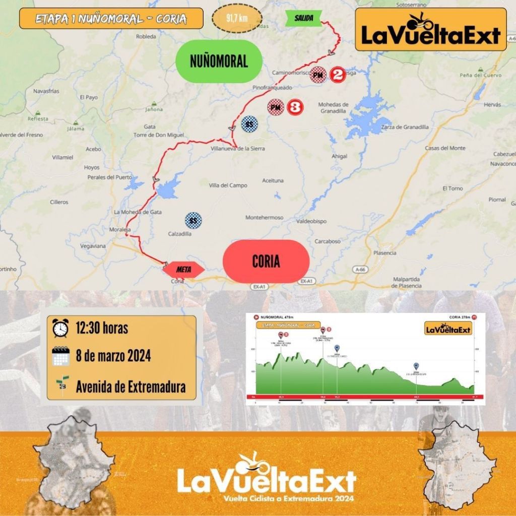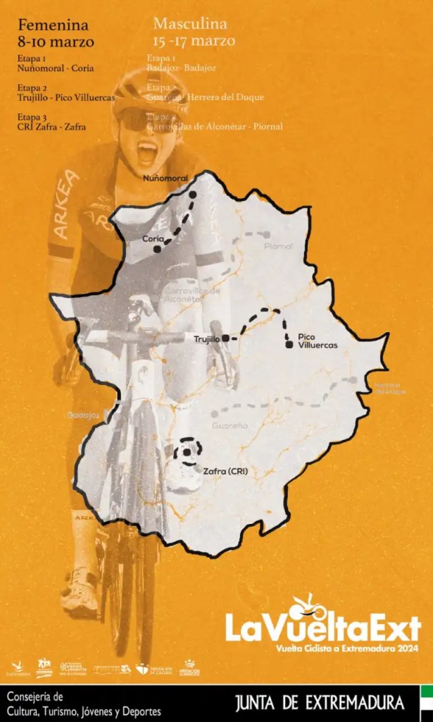 La Vuelta Ciclista a Extremadura femenina comenzará el 8 de marzo, en Nuñomoral, con motivo del Día Internacional de la Mujer, y se prolongará hasta el 10. Será una cita de carácter internacional en la que participarán 119 ciclistas. El recorrido atravesará la región, desde Nuñomoral hasta Coria en la primera etapa (90 km y desnivel acumulado de 1.090 metros), desde Trujillo hasta Pico Villuercas en la segunda (96,6 km y desnivel acumulado de 2.107 metros), y finalizará con una contrarreloj en Zafra (20 kilómetros), donde se conocerá a la ciclista ganadora de la ronda extremeña de 2024.