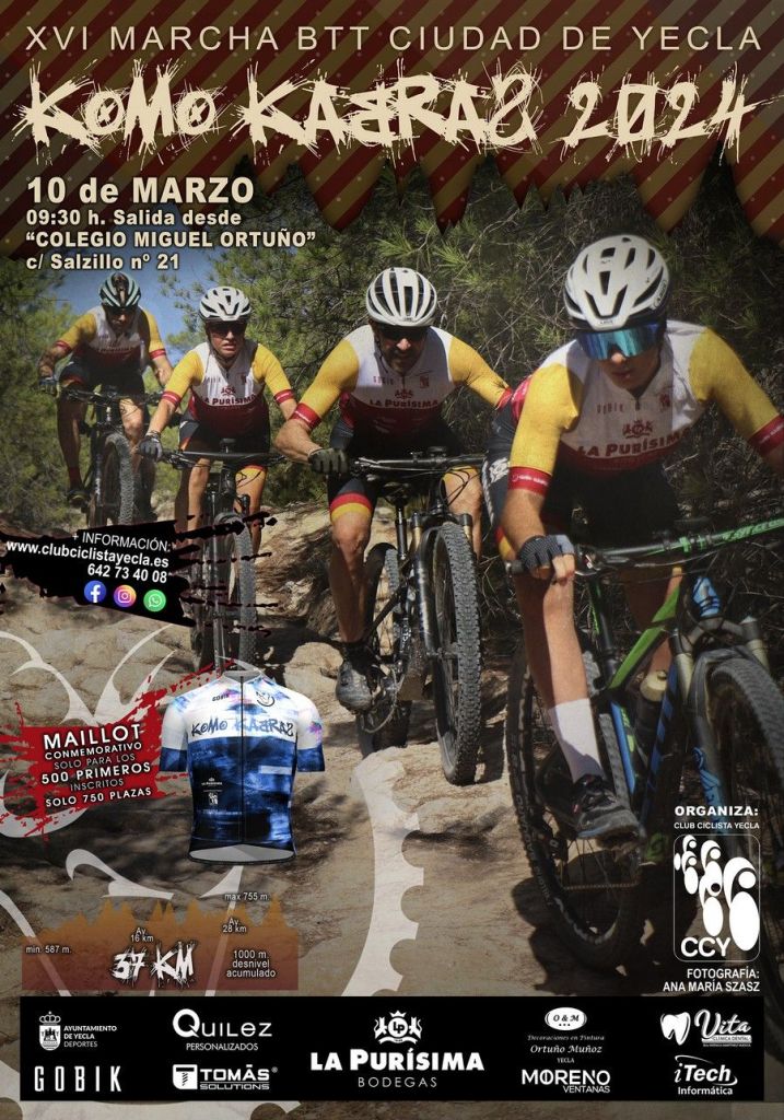 El domingo, día 10 de marzo, se disputa la XVI Marcha BTT Ciudad de Yecla – KOMOKABRAS 2024. El Club Ciclista Yecla es el organizador de esta popular prueba ciclista, en la que se espera una alta participación de aficionados al deporte del pedal. La salida neutralizada será a las 9:30 horas junto al «Colegio Miguel Ortuño», C/ Salzillo nº 21. El recorrido consta de 37 Km, 1.000 metros. de desnivel y nivel físico-técnico medio-alto.
