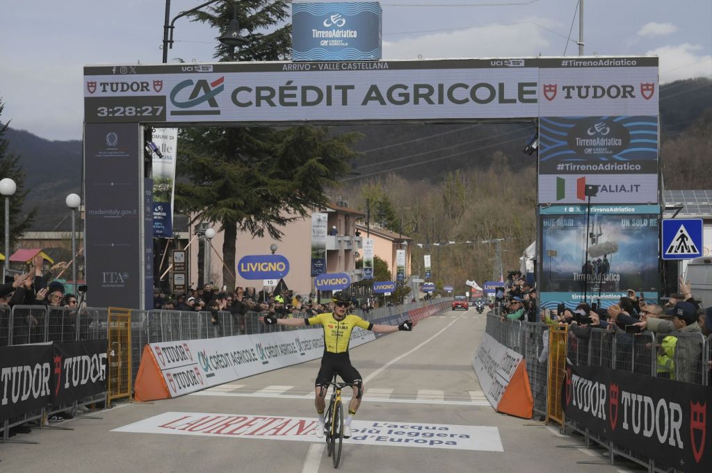 Jonas Vingegaard ha ganado la quinta etapa de la Tirreno-Adriático. El danés de Visma|Lease a Bike, que también es el nuevo líder, atacó nada menos que a 29 kilómetros de la meta. Al final cruzó la meta con más de un minuto de ventaja. Logró un doblete convincente. Juan Ayuso ganó el sprint por la segunda plaza, justo por delante de Hindley y O’Connor Arensman y completó el top 5, Uijtdebroeks quedó sexto.