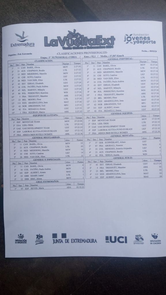 Olivia Baril gana la primera etapa de la Vuelta a Extremadura Femenina. La ciclista canadiense del equipo Movistar ha ganado la primera etapa de la Vuelta Ciclista a Extremadura Femenina, disputada este viernes entre las localidades cacereñas de Nuñomoral y Coria, por lo que se sitúa líder de la misma. Baril se impuso de forma holgada con dos segundos de ventaja sobre un cuarteto que encabezó la australiana Brodie Chapman, del equipo Lidl-Trek. Además, las bonificaciones permiten a la corredora de Movistar liderar la general sobre la oceánica con doce segundos de diferencia, catorce respecto a la neerlandesa Mareille Meijering, también de Movistar, y 18 respecto a la chilena Catalina Soto (Laboral Kutxa), la neerlandesa Ellen van Dijk (Lidl Trek), que volvía a competir tras ser madre, y la colombiana Paula Patiño (Movistar). En la general sub 23 Ainara Albert ha sido quinta. Tiene r maillot blanco de primera joven.