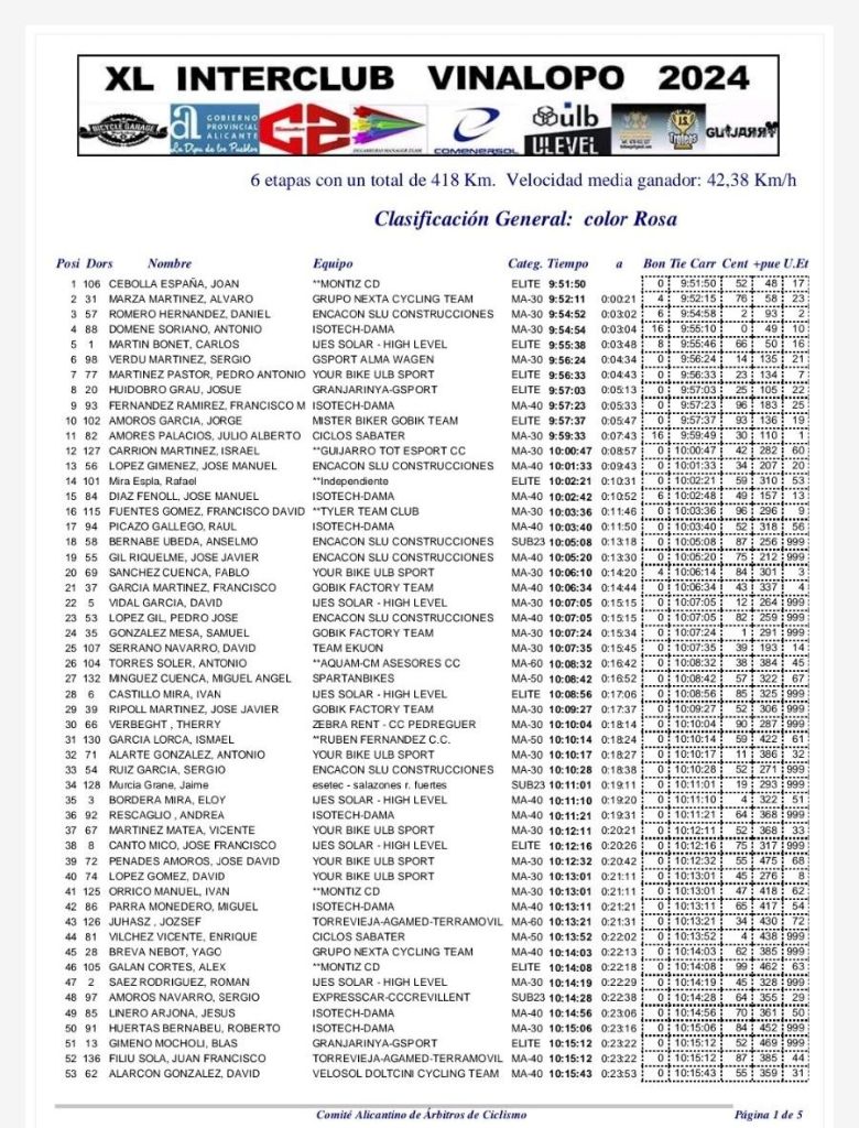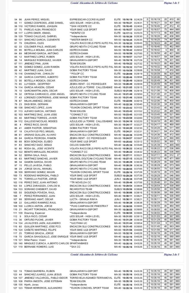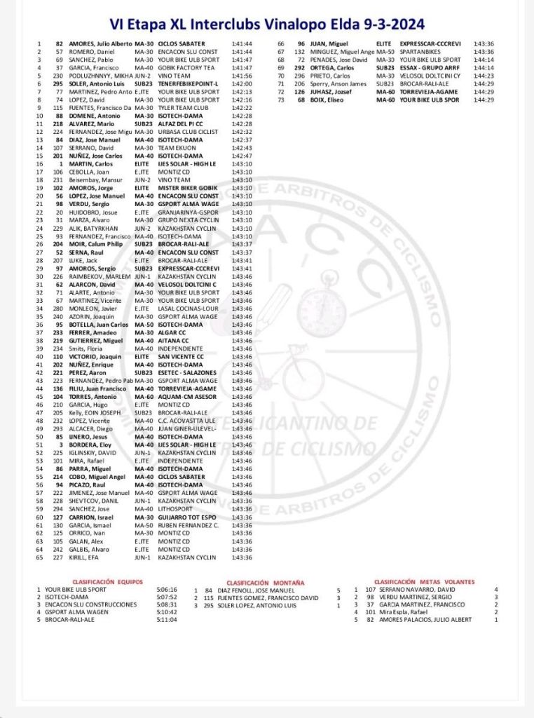En la general del Torneo Joan Cebolla sigue de líder, con Álvaro Marza segundo y Daniel Romero, tercero. Cebolla también es el mejor Élite y Sub23; Álvaro Marzá domina en M30; Francisco Manuel Fernández, en M40; Miguel Ángel Mínguez, en M50; y Antonio Torres, en M60. Francisco David Fuentes domina la clasificación de la montaña; Rafael Mira, las Metas Volantes; Antonio Domene, la Regularidad; y el Isotech-Dama, la de los equipos.