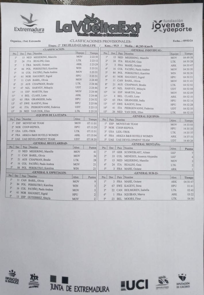 Mareille Meijering (Movistar Team) ha ganado la segunda etapa de la Vuelta a Extremadura bajo una intensa granizada y se ha situado como líder de la clasificación general, demostrando el gran dominio del equipo navarro, que se llevó la primera etapa con Olivia Baril y hoy vuleve a triunfar gracias a la neerlandesa Meijering, que fraguó su triunfo en un rápido descenso en el que dejó de lado a sus cinco compañeras de fuga. Se canceló, por la mala climatología, la ascensión final al Pico Villuercas, de tal forma que la etapa terminó en Guadalupe.