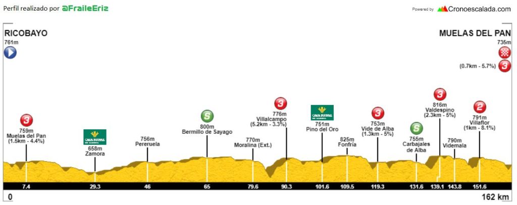 Casi 200 ciclistas, el máximo permitido, tomarán la salida desde Ricobayo a las 10 horas de la mañana de este domingo 17 de marzo para afrontar los 161 kilómetros de la prueba. En la primera mitad del trazado destaca el siempre vistoso y animado paso por las calles de Zamora y su Puente de Hierro, para dirigirse hasta Bermillo de Sayago, donde ya se gira a la derecha en busca de Villalcampo. A partir de ahí comienza la verdadera dureza de la carrera al ir encadenando 5 cotas diferentes, destacando el muro de los Molinos de Villaflor, donde las rampas llegan a alcanzar pendientes de hasta el 20% de desnivel. Esa subida se superará a tan solo 10 kilómetros de la pancarta de meta, que estará ubicada también en el ascenso a Muelas del Pan.