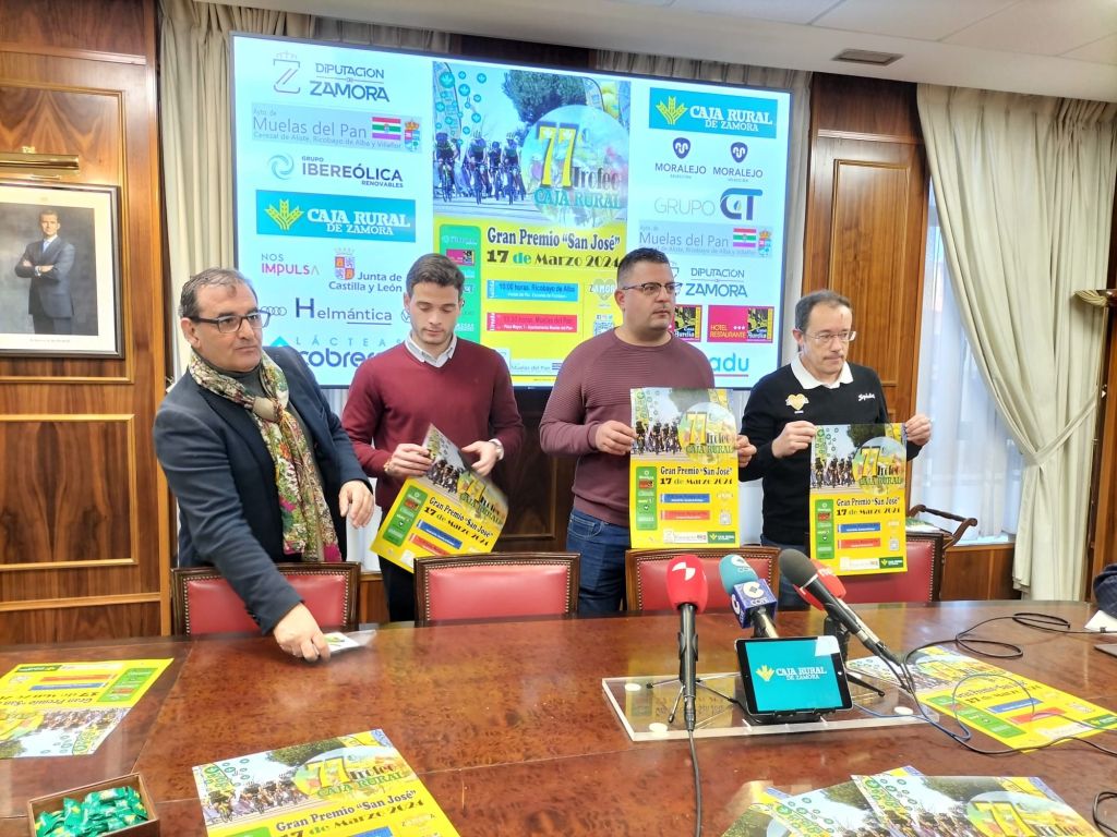 Este lunes, 11 de marzo, la sede central de Caja Rural de Zamora ha vuelto a acoger un año más la presentación oficial del Trofeo Caja Rural-GP San José de Ciclismo que se celebrará en Muelas del Pan el próximo domingo. La 77ª edición de la gran clásica zamorana, una de las citas ciclistas más longevas y prestigiosas de todo el calendario ciclista nacional, repetirá el trazado que se innovó la temporada pasada y que tan buen espectáculo deparó. El acto contó con la presencia de Narciso Prieto, director de comunicación de Caja Rural Zamora, Juan del Canto, diputado de Deportes, Luis Alberto Miguel Alonso, alcalde de Muelas del Pan, y Manuel Campesino, presidente del CDC Zamora, club organizador de la prueba. Este último se encargó de advertir sobre la exigencia del itinerario: “A consecuencia de las obras que se mantienen en el Puente de Requejo, el pelotón se encontrará con el recorrido de hace un año. No hemos querido variar nada porque vimos una carrera preciosa y todos, equipos, patrocinadores y