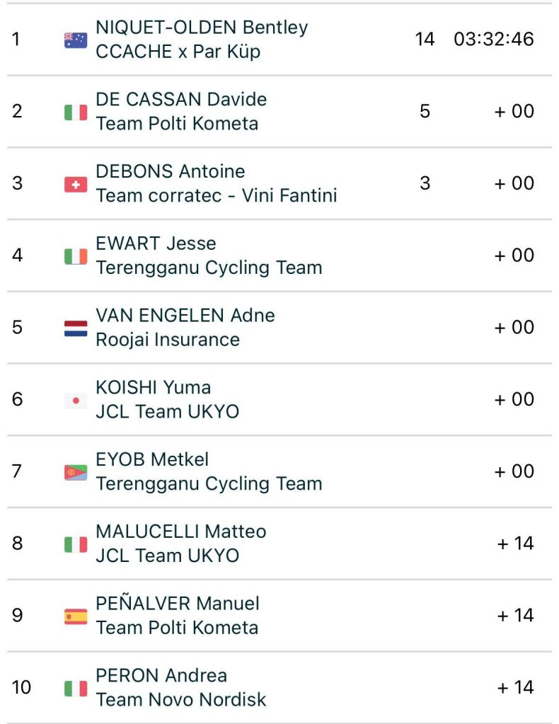 Bentley Niquet-Olden (CCache) se ha impuesto desde la escapada en la tercera etapa del Tour de Taiwán. A 14 segundos ha entrado el pelotón con Matteo Maluccelli (JCL Team) en primer lugar y Manuel Peñalver (Team Polti Kometa), segundo, que ha firmado una novena plaza. Mason Hollyman (Israel) sigue de líder.