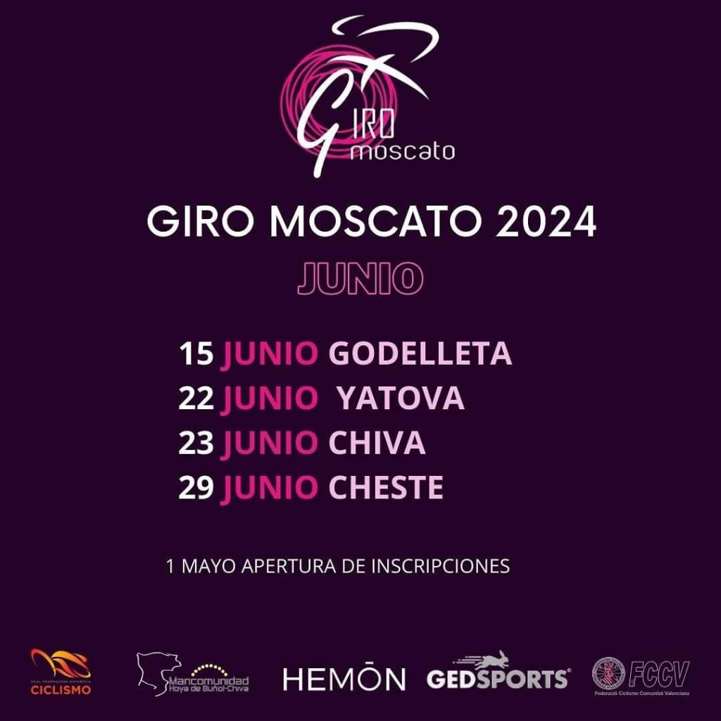 El Giro Moscato 2024 se disputará en junio dividido en cuatro jornadas. Dará comienzo en Godelleta el 15 junio y luego tendrá continuidad en Yátova (22 de junio), Chiva (23) y Cheste (29). El 1 de mayo se abrirán las inscripciones.