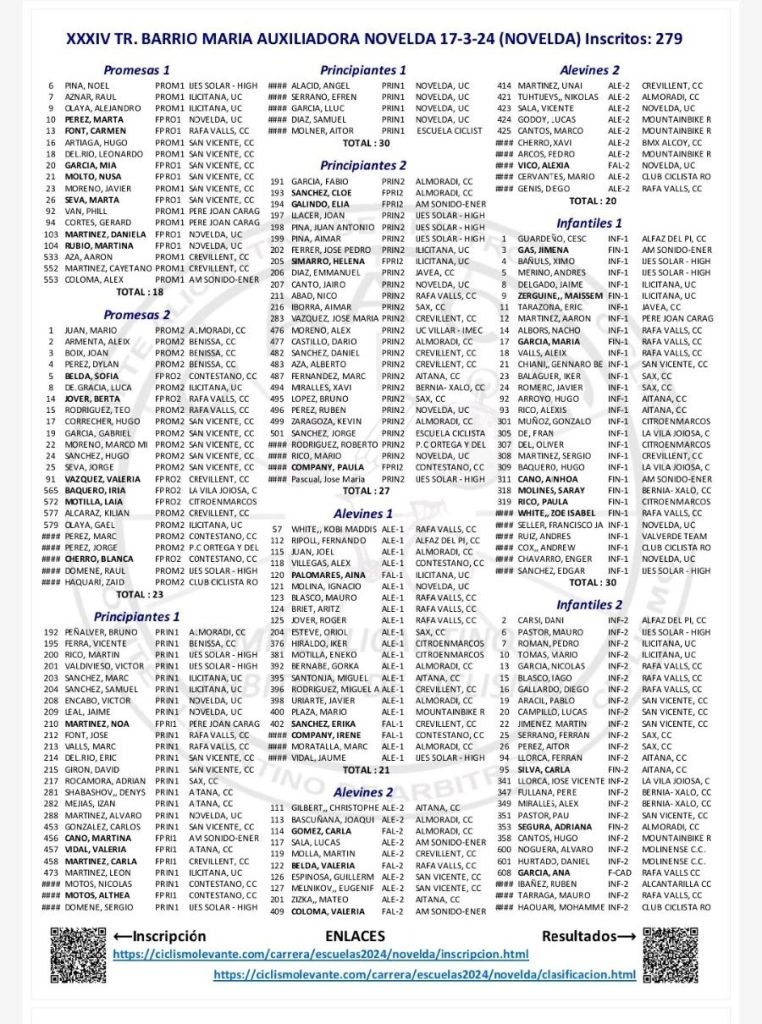 Llegan como líderes a la prueba noveldense Aimar Ruiz (Grup Dos Rodes) y Nusa Moltó (San Vicente), en Promesas 1; Gael Olaya (UC Ilicitana) y Iria Baquero (La Vila Joiosa), en Promesas 2; Izán Mejías (Aitana) y Valeria Vidal (Aitana) en Principiantes 1; Jorge Sánchez (Yecla) y Elía Galindo (AM Sonido), en Principiantes 2; Manuel Muñoz (Yecla), en Alevines 1; Ariel Curiel (Grup Dos Rodes), en Alevines 2; Ximo Bañuls (Ijes Solar), en Infantiles 1; y Nicolás García (CC Rafa Valls), en Infantil 2.