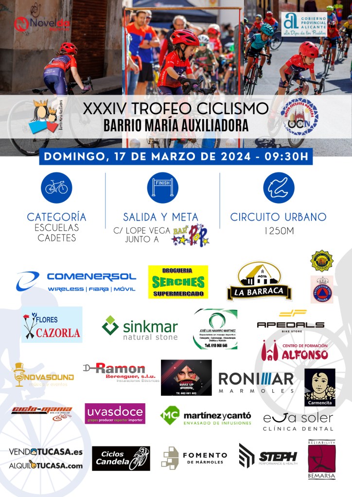 El domingo, día 17 de marzo, se disputa en Novelda la segunda jornada del la Challenge de Escuelas de la Provincia de Alicante que comenzó el pasado sábado en Benissa. El XXIV Trofeo Barrio Maria Auxiliadora se disputará en la calle Lope de Vega de la localidad alicantina, organizado por la Unión Ciclista Novelda a partir de las 9:30 horas. La competición se desarrollará en un circuito urbano de 1.250 metros. Hay 279 corredores preinscritos.